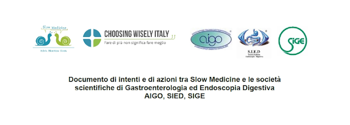 Le società scientifiche AIGO (Associazione Italiana Gastroenterologi ed Endoscopisti Digestivi Ospedalieri), SIED (Società Italiana di Endoscopia Digestiva) e SIGE (Società Italiana di Gastroenterologia ed Endoscopia Digestiva) concordano dunque nel definire, con l’associazione Slow Medicine, azioni atte a favorire l’applicazione delle raccomandazioni di CW Italy e dei RAO nelle aziende sanitarie italiane, che comprendano iniziative di formazione gestite insieme ai medici delle cure primarie ed agli specialisti e progetti di implementazione.