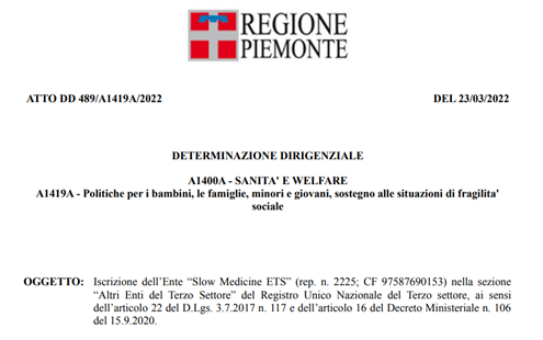 L’associazione Slow Medicine, con Atto della Regione Piemonte del 23/03/2022, è stata iscritta come Ente “Slow Medicine ETS” nel Registro Unico Nazionale del Terzo Settore (RUNTS).