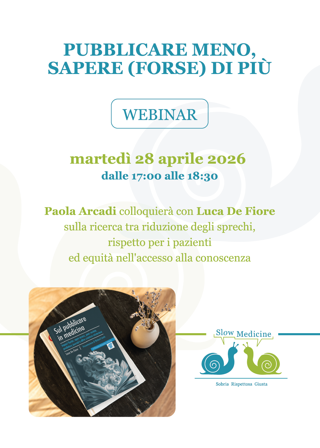 Siamo lieti di comunicare che martedì 28 aprile, dalle 17:00 alle 18:30, si terrà il Webinar “Pubblicare meno, sapere (forse) di più“, Paola Arcadi colloquierà con Luca De Fiore.